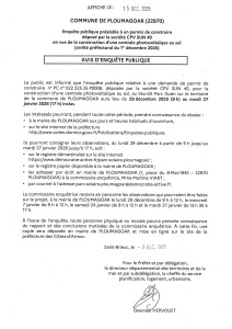 Avis enquête publique commune de Ploumagoar permis de construire centrale photovoltaïque au sol