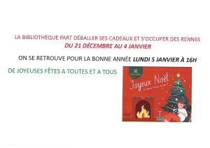 Bibliothèque fermée du 21 décembre au 4 janvier, réouverture le lundi 15 janvier à 16h