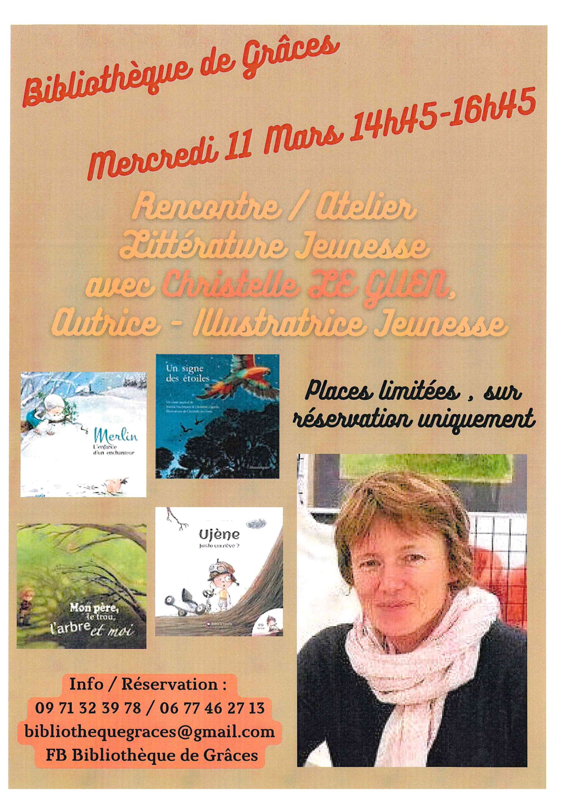 Accueil / Bibliothèque : Le 11 mars de 14h45 à 16h45 Rencontre / atelier avec Christelle LE GUEN autrice, illustratrice jeunesse. Sur réservation au 06 77 46 27 13