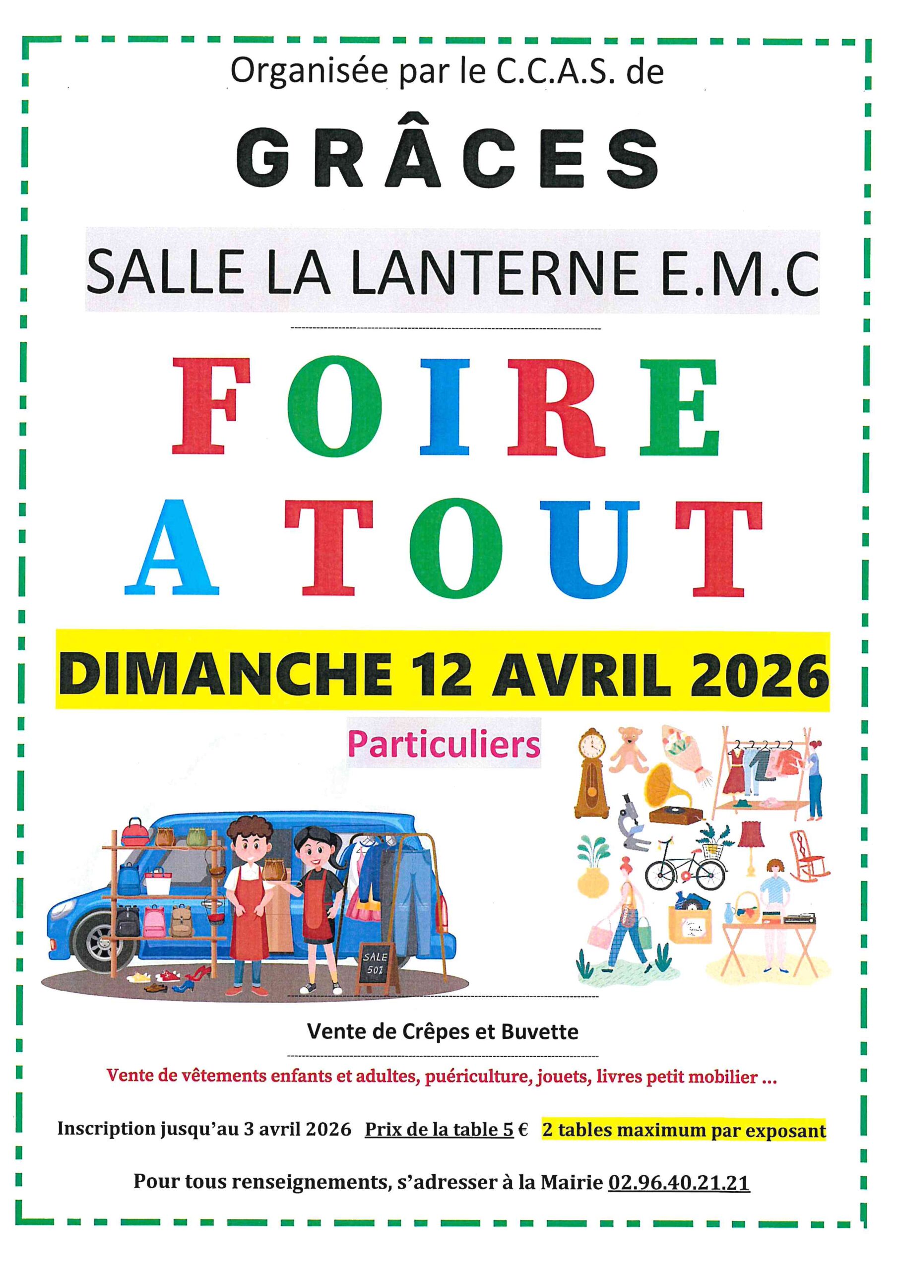 Foire à Tout, organisée par le CCAS de Grâces le dimanche 12 avril 2026, salle La Lanterne de 9h à 18h, inscriptions en Mairie