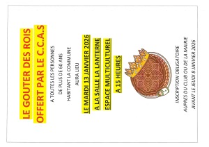 Goûter des Rois, offert par le CCAS aux Grâcieuses et Grâcieux de plus de 60 ans, mardi 13 janvier 2026 à 15h00 salle la Lanterne. Inscription au 02 96 40 21 28 avant le jeudi 8 janvier