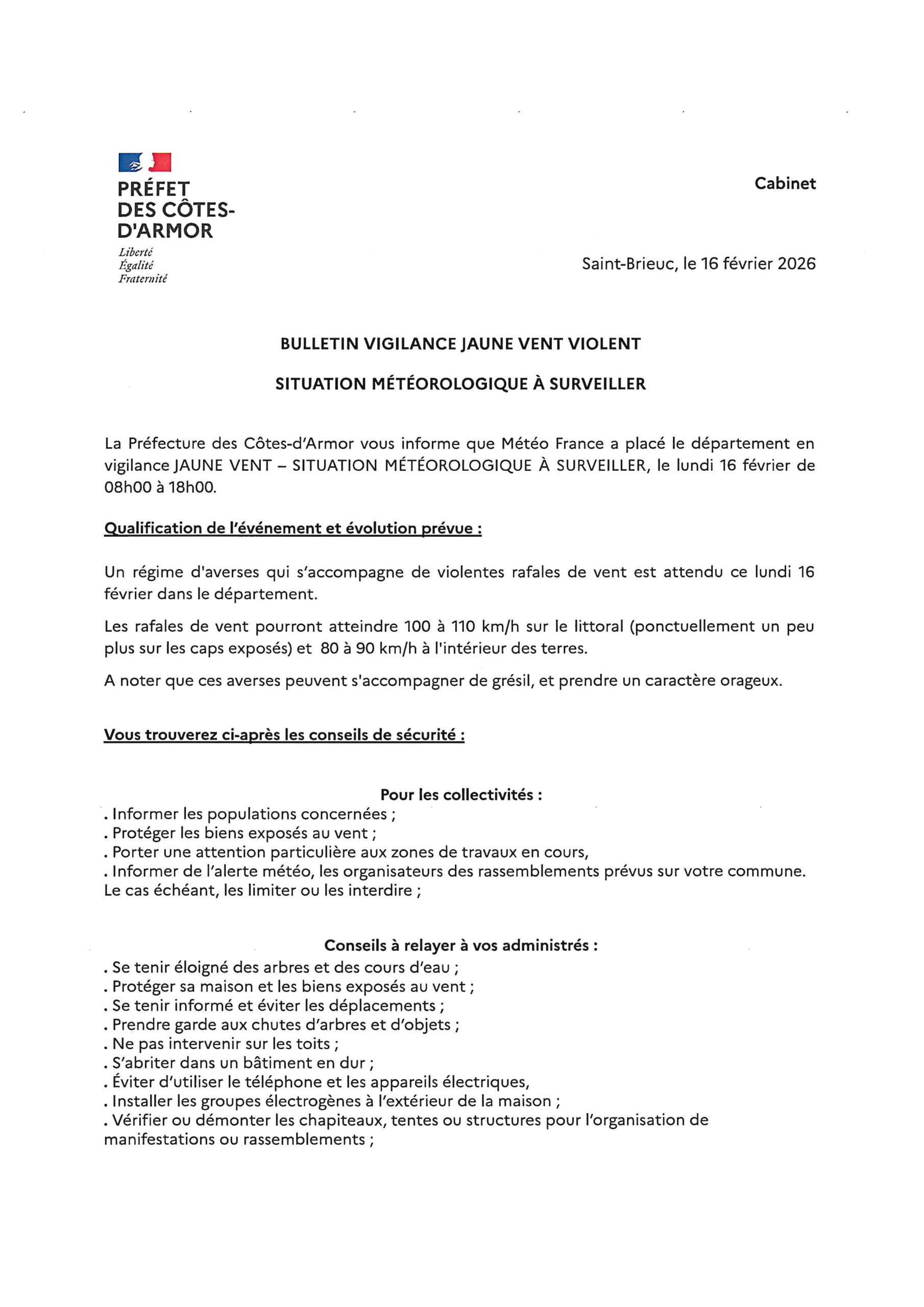 Préfecture : Bulletin vigilance jaune vent violent lundi 16 février de 8h à 18h